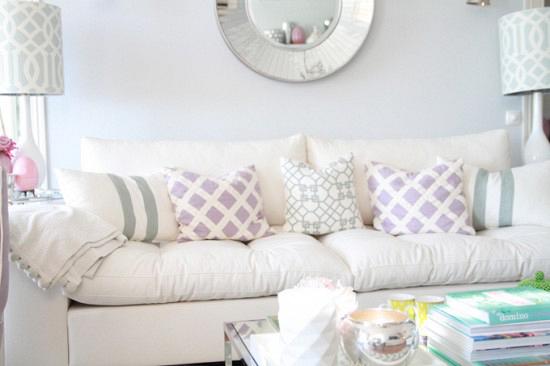 | Λευκό, μπεζ στον τοίχο, τιρκουάζ και στο βάθος πράσινο. Οι λευκοί καναπέδες που τόσο αρέσουν θα μπορούσαν να συνδυαστούν υπέροχα με σκουρόχρωμα τραπεζάκι και μερικά εντυπωσιακά, χρωματιστά μαξιλάρια |